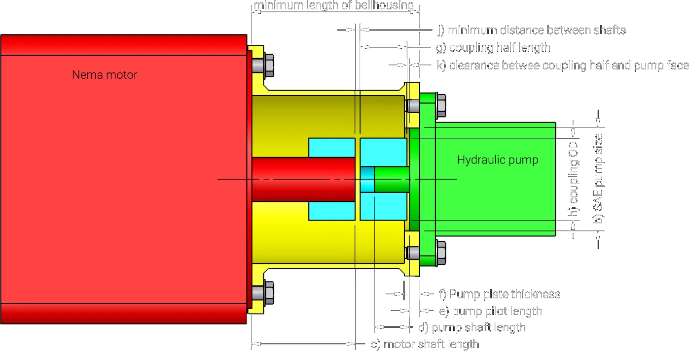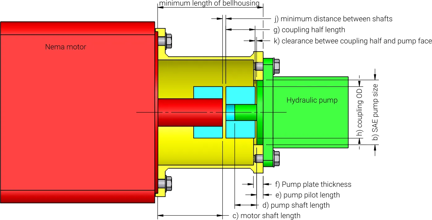 Once you have determined what electric motor, hydraulic pump, and coupling you are using you will need to know the following to find the minimum length of bellhousing required. Our values for this examples are in brackets ( )